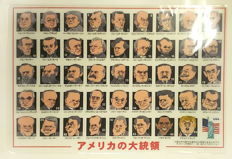 歴代のアメリカ大統領の似顔絵入りクリアファイルです。
